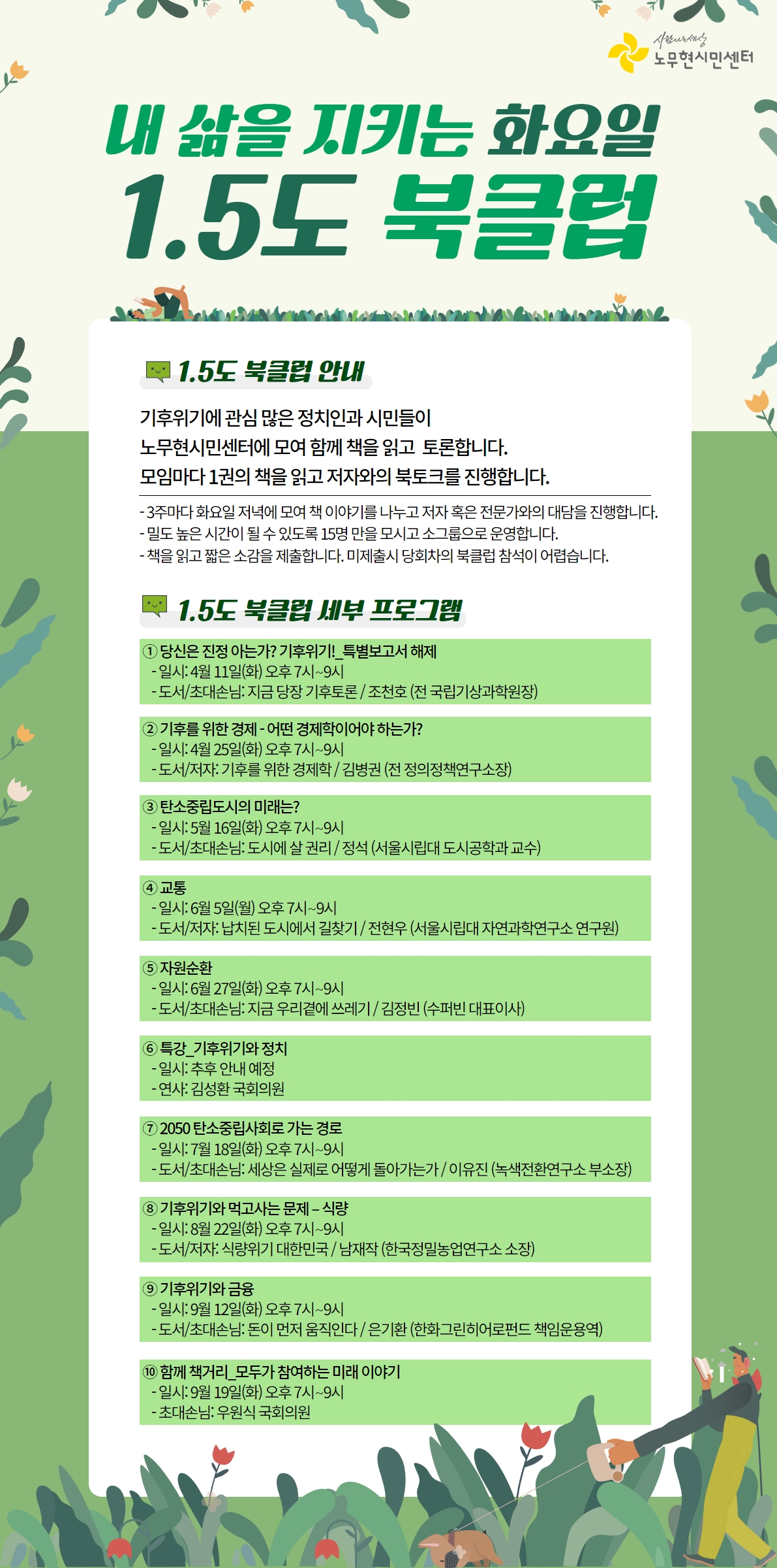 내 삶을 지키는 화요일, '1.5도 북클럽'에 대한 시민분들의 많은 관심과 참여에 감사드립니다.모집이 조기 마감되었음에도 불구하고, 꾸준한 문의와 대기접수 인원이 늘고있어두 번째 1.5도 북클럽 모집을 개시하려 합니다.1.5도 북클럽 접수마감이 아쉬웠던 분이라면 지금 바로 '대기신청' 버튼을 클릭해주세요!담당자가 별도 연락 드리도록 하겠습니다 :)- 기후위기에 관심 많은 정치인과 시민들이 노무현시민센터에 모여 함께 책을 읽고 토론합니다.- 모임마다 1권의 책을 읽고 저자 또는 전문가와의 북토크를 진행합니다.- 모임 참석 전, 책을 읽고 간단한 소감문(500자 내외)과 함께 나눌 질문을 제출해야 합니다.- 미제출시 당 회차의 북클럽 모임 참석이 어렵습니다. -