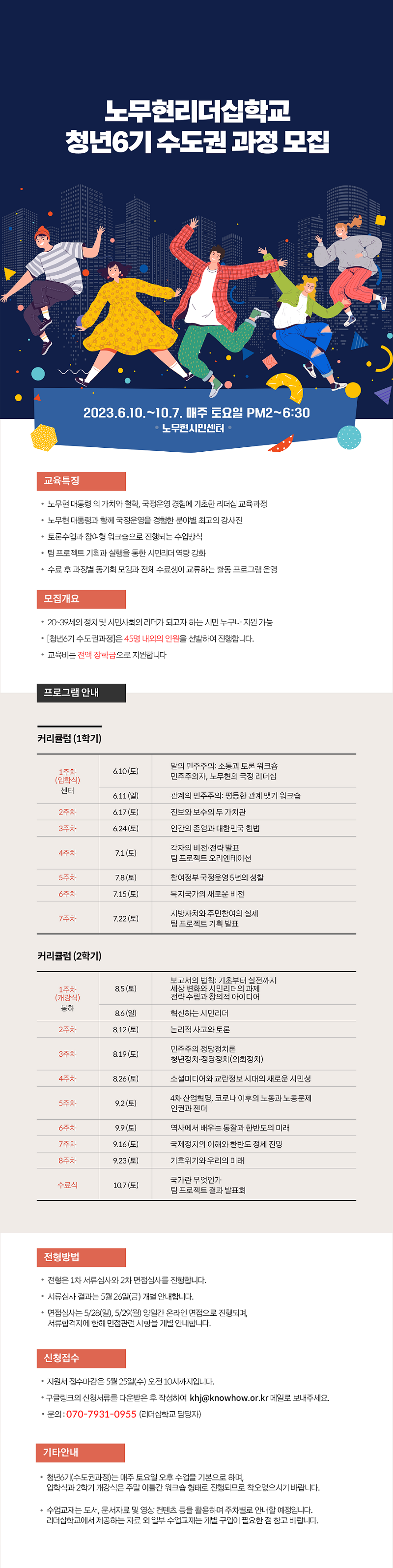 교육기간- 교육기간 : 2023년 6월 10일(토)~10월 7일(토) 매주 토요일 오후 2시~6시 30분- 교육장소 : 노무현시민센터 1층 다모여 강의실 (서울시 종로구 창덕궁길 73)※ 1학기 1주차는 6/10(토), 6/11(일) 양일간 노무현시민센터 지하2층 다목적홀 '가치하다'에서 진행합니다.※ 2학기 1주차는 봉하마을 1박2일 워크숍이 예정되어 있습니다.전형방법- 전형은 1차 서류심사와 2차 면접심사를 진행합니다.- 서류심사 결과는 5월 26일(금) 개별 안내합니다.- 면접심사는 5/28(일), 5/29(월) 양일간 온라인 면접으로 진행되며, 서류합격자에 한해 면접 관련 사항을 개별 안내합니다.신청접수- 지원서 접수마감은 5월 25일(목) 오전 10시까지입니다.- 아래 구글링크의 신청서류를 다운받은 후 작성하여 khj@knowhow.or.kr 메일로 보내주세요.- 청년6기 지원서 다운로드 링크:(클릭해주세요☞) https://bit.ly/3mQaTsd- 문의: 070-7931-0955 (리더십학교 담당자)안내사항- 청년6기(수도권과정)는 매주 토요일 오후 수업을 기본으로 하며, 입학식과 2학기 개강은 주말 이틀간 워크숍 형태로 진행되므로 착오없으시기 바랍니다.- 수업교재는 도서, 문서자료 및 영상 컨텐츠 등을 활용하며 주차별로 안내할 예정입니다. 리더십학교에서 제공하는 자료 외 일부 수업교재는 개별 구입이 필요한 점 참고 바랍니다.![[크기조정] 청년6기 웹자보.png](/data/smarteditor2/upload/202305121353361207562448.png)