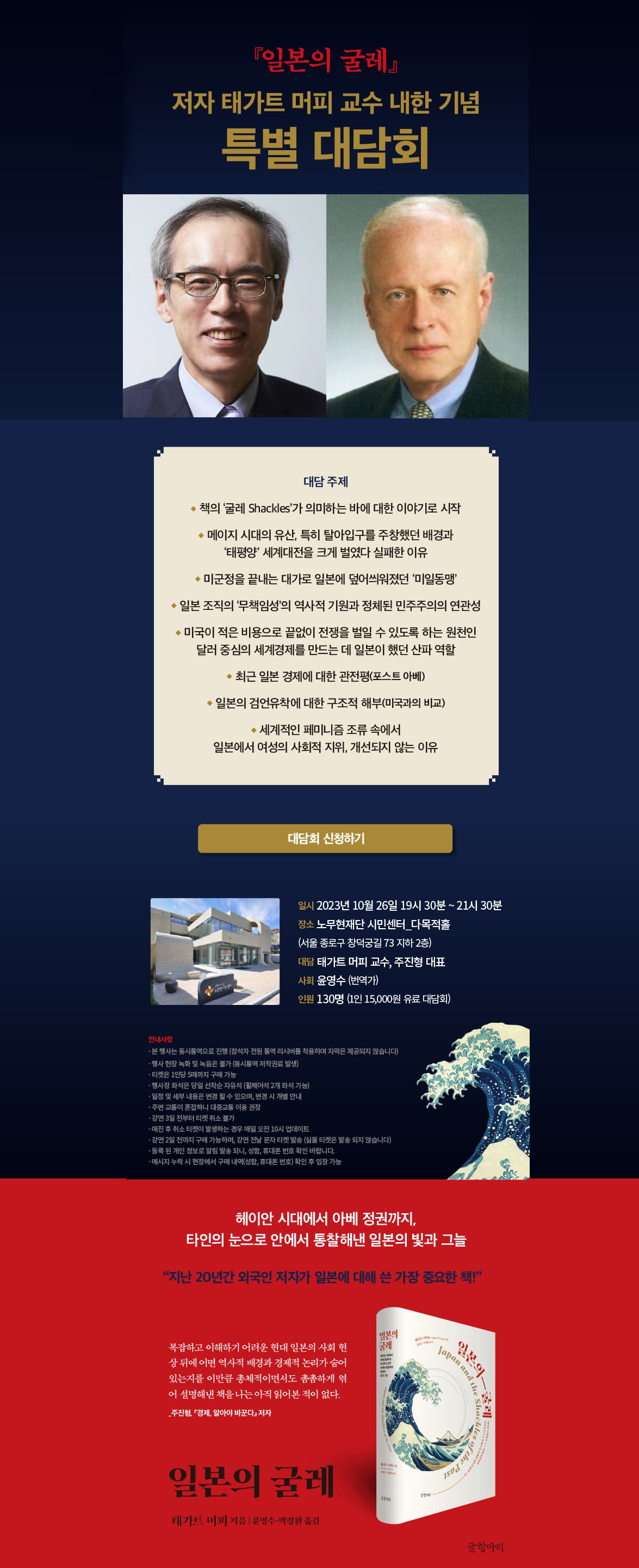 ※ 본 행사는 글항아리에서 주최하는 행사입니다._ 참가신청은 반드시 아래 '참가신청' 링크를 통해 별도로 하셔야 하며, 본 페이지에서의 참가신청은 유효하지 않습니다.『일본의 굴레』 저자 태가트 머피 교수 내한 기념 특별 대담회장소 : 노무현재단 시민센터_다목적홀 (서울 종로구 창덕궁길 73 지하 2층)대담 : 태가트 머피 교수, 주진형 대표사회 : 윤영수 번역가인원 : 130명참가비 : 15,000원 (1인 기준)복잡하고 이해하기 어려운 현대 일본의 사회 현상 뒤에 어떤 역사적 배경과 경제적 논리가 숨어 있는지를이만큼 총체적이면서도 촘촘하게 엮어 설명해낸 책을 나는 아직 읽어본 적이 없다._주진형,『경제, 알아야 바꾼다』 저자 -