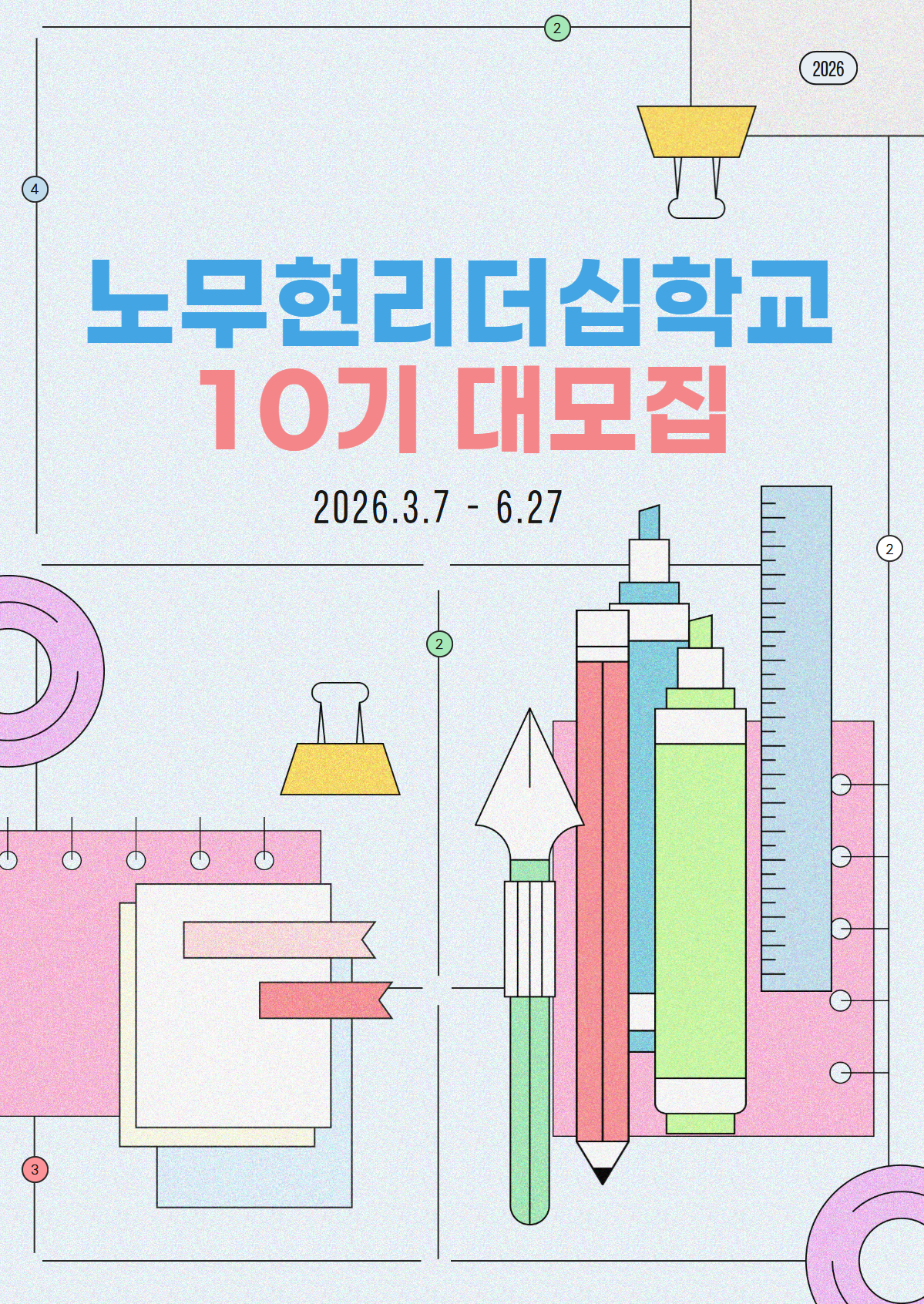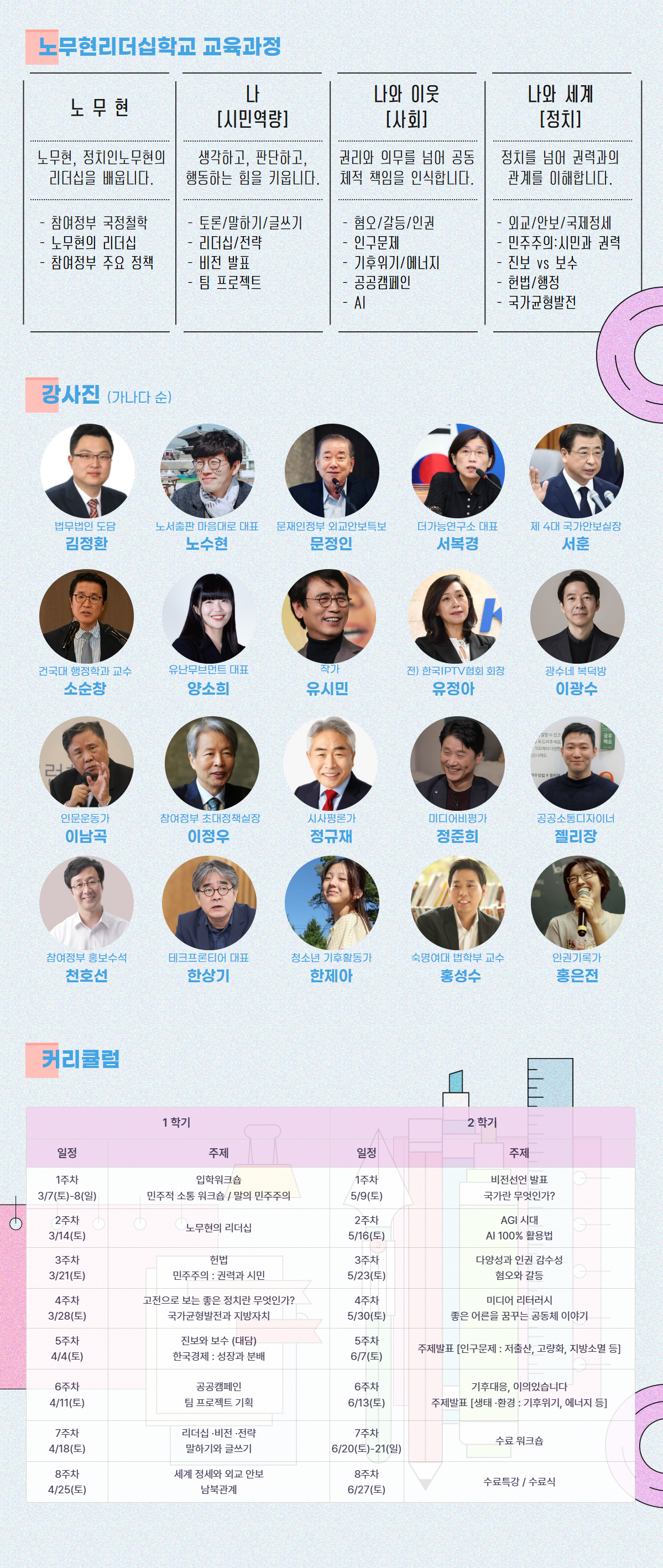 일정 2026년 3월 7일~6월 27일 / (16주) / 매주 토요일 13시~18시(5시간)- 입학워크숍 3/7(토)-8(일) 1박 2일 봉하마을 (★필수)- 평화워크숍 6/20(토)-6/21(일) 1박 2일 강원도 인제군 (★필수)장소 노무현시민센터 (종로구 창덕궁길 73 / 안국역) 1층 다모여 강의실대상 정치적 사고와 행동하는 시민으로 성장하고자 하는 청·장년모집인원 35명 이내교육비 120만원 / 후원회원 100만원- 만 39세 이하(86년 3월 이후 출생) 청년은 노무현재단 회원의 후원금으로 교육비를 100% 지원합니다.- 지역할인 : 최대 30% (지역별 차등 할인 적용)