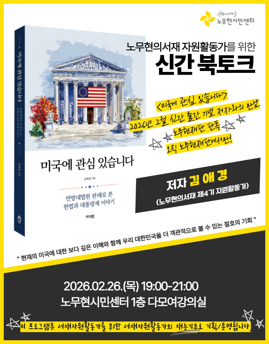 노무현의서재 제4기 자원활동가(김애경)의 저서 <미국에 관심 있습니다>(가디언, 2026) 가 출간되었습니다.