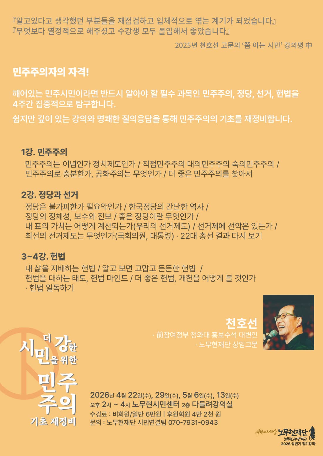 [센터|시민|오프라인] [노무현시민학교 정기강좌] 더 강한 시민을 위한 민주주의 기초 재정비 (2026.4.22. ~ 2026.5.13.)