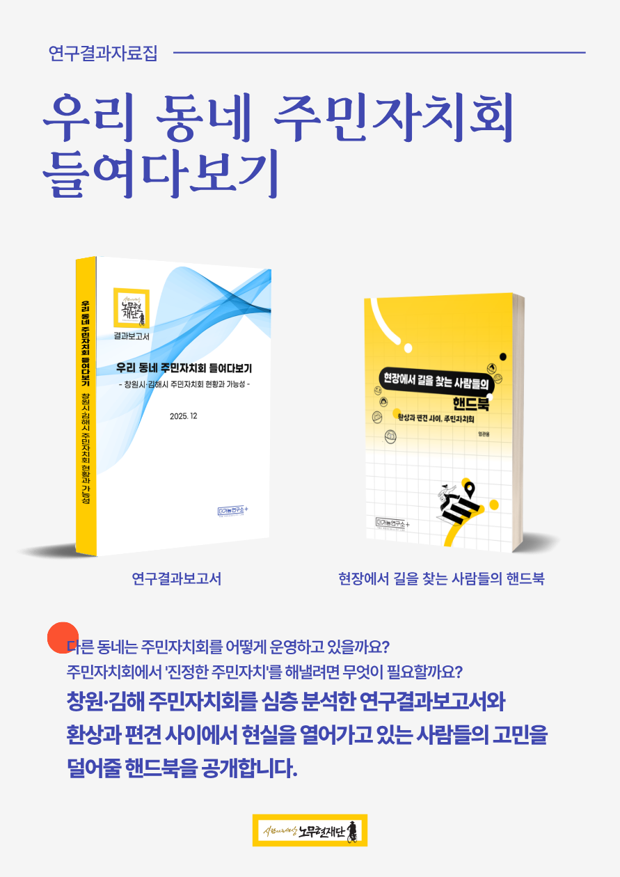 이번 연구는 그 연장선에서 창원과 김해의 주민자치회 사례를 통해 지역의 풀뿌리 민주주의를 구체적으로 들여다본 작업입니다.