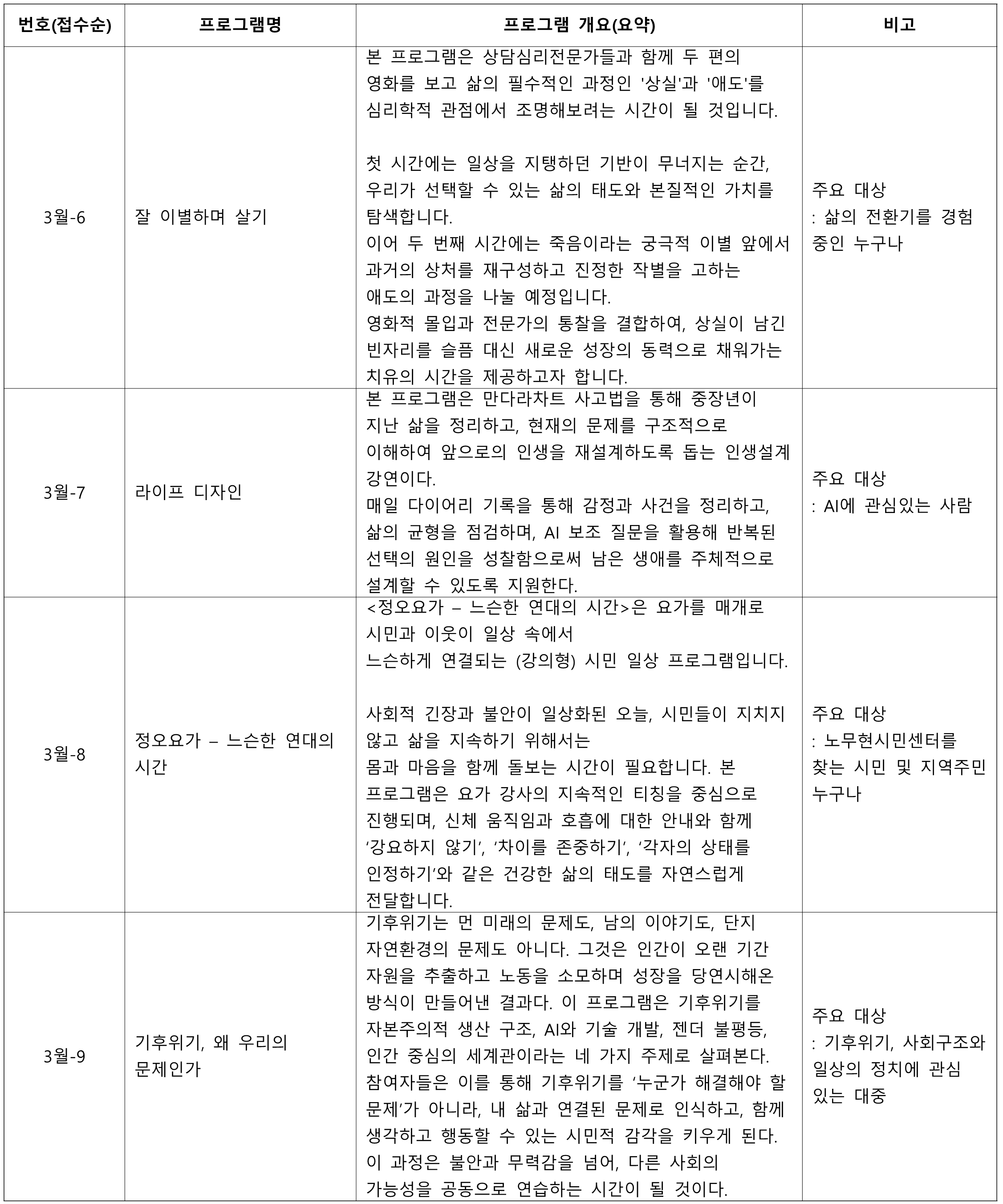 하단의 후보 프로그램 소개를 읽어보고 내가 노무현시민센터에서 참여하고 싶은 프로그램 3개를 선택해주세요.(3개 선택 필수)