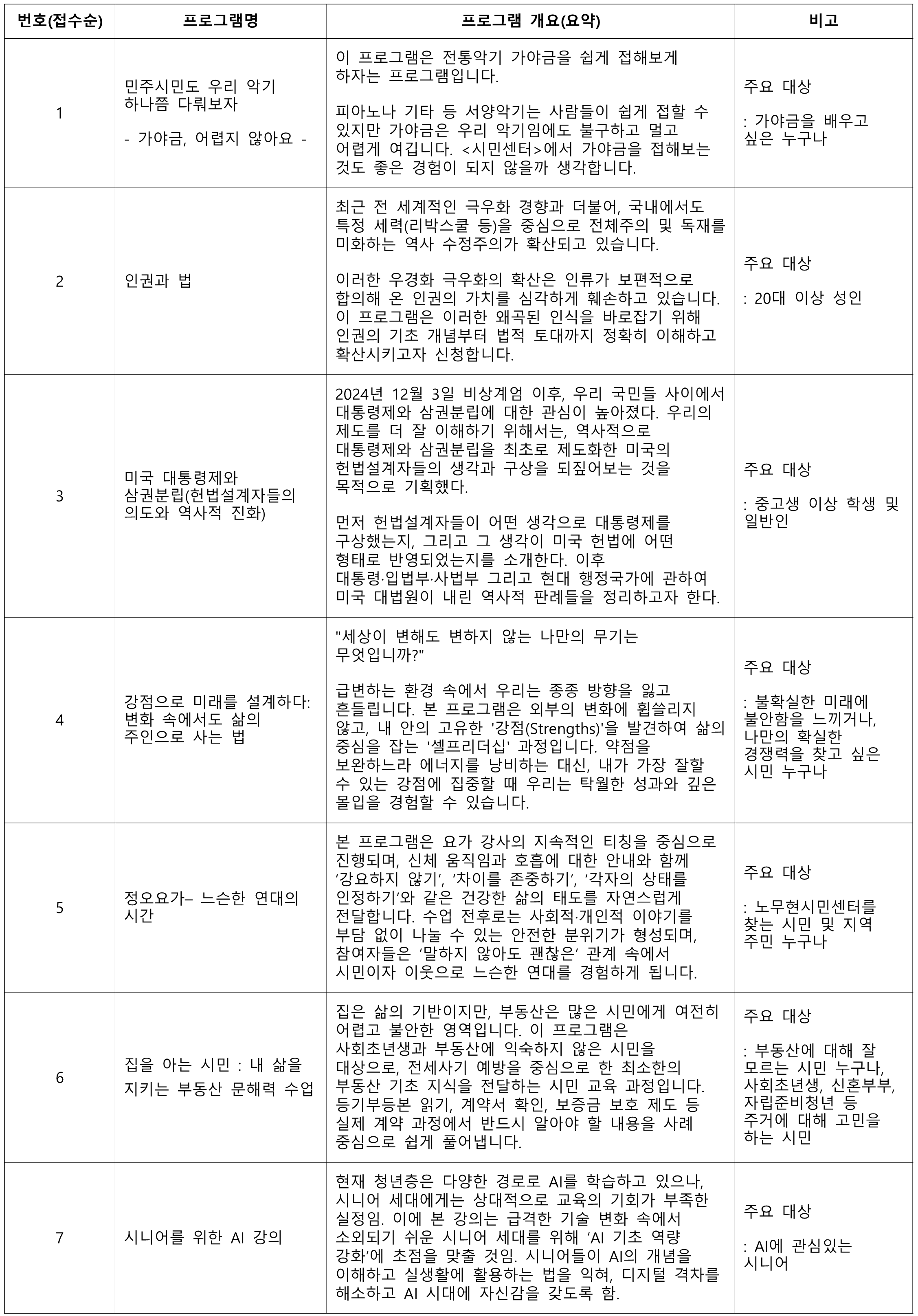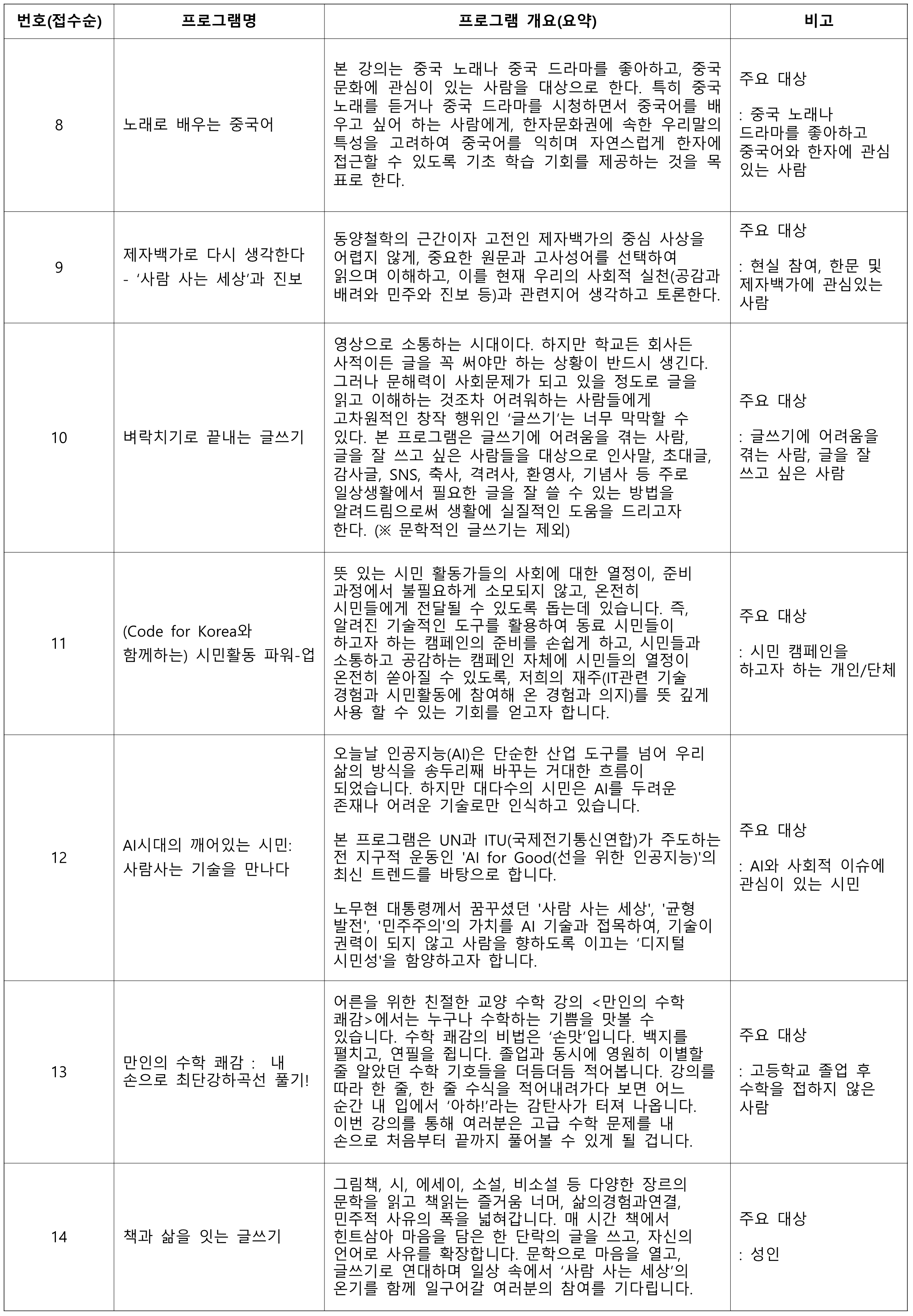 선정 방법 : 시민투표 100%(다득표 프로그램 3개 선정)※ 운영 협의가 어려운 경우 차순위 프로그램 선정