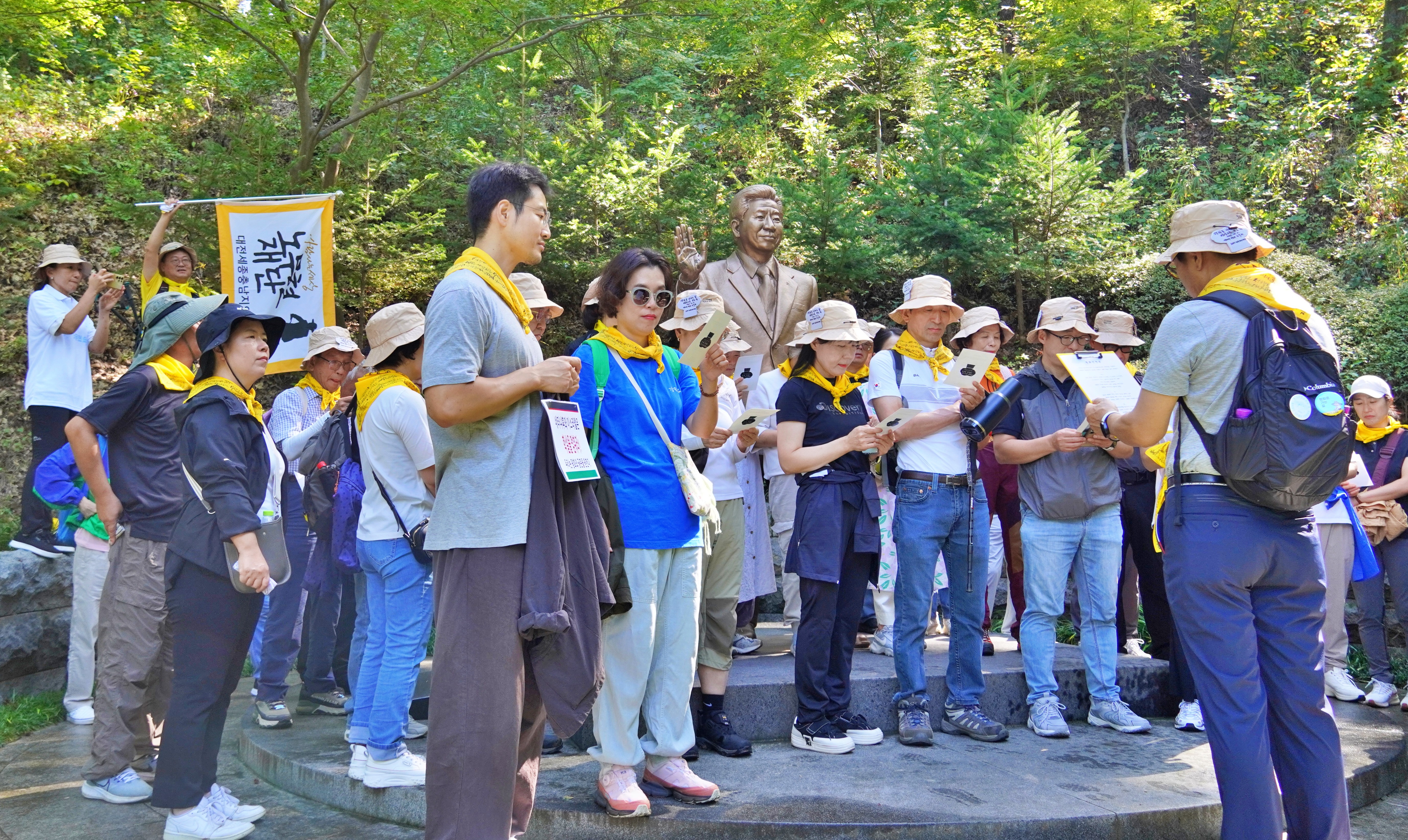 회원들과 함께 '화합의 길'을 걸으며 그 끝에 세워진 노무현 대통령 동상 앞에서 평화선언문을 낭독하였고, 노무현 대통령과 참여정부가 남긴 평화의 뜻과 의지를 다시금 되새겼습니다.